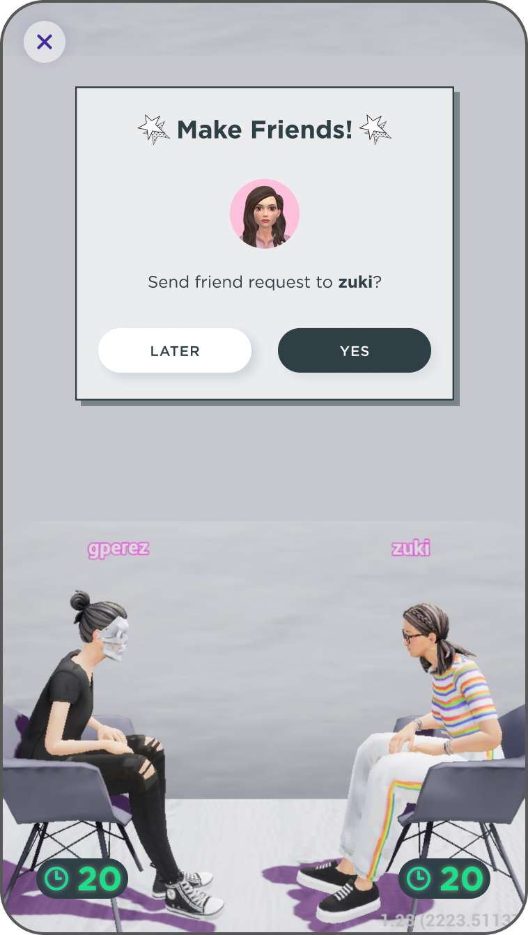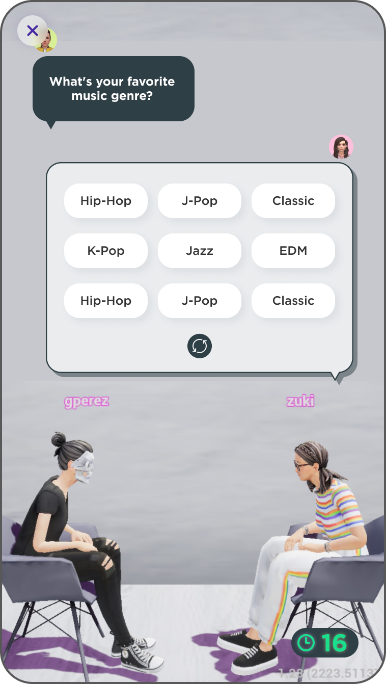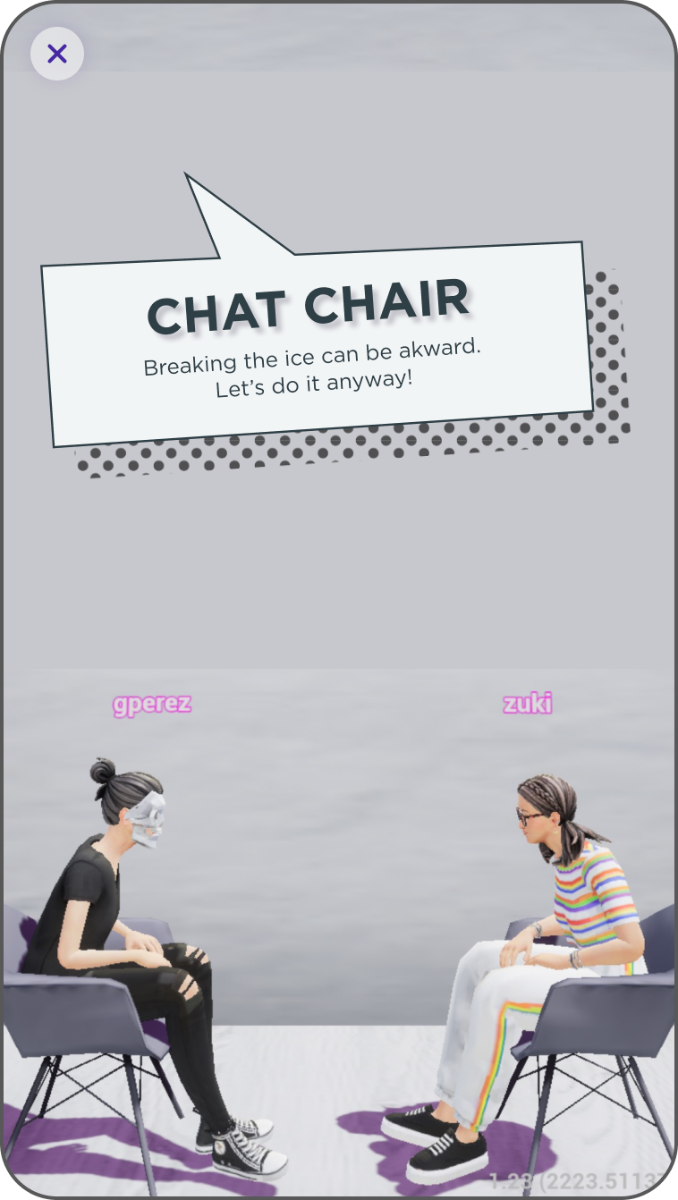Chat Chair lowers the barrier to meeting someone new. It’s a two-seat ritual for low-pressure 1:1s: when one seat fills, the room gets a friendly invite; four short prompt-and-answer rounds keep things structured and positive—emotes included, with no open text during play to avoid negativity. Chairs are themed (movies, music, etc.) to align interests without extra UI weight. At the end, players can keep chatting and add each other as friends.