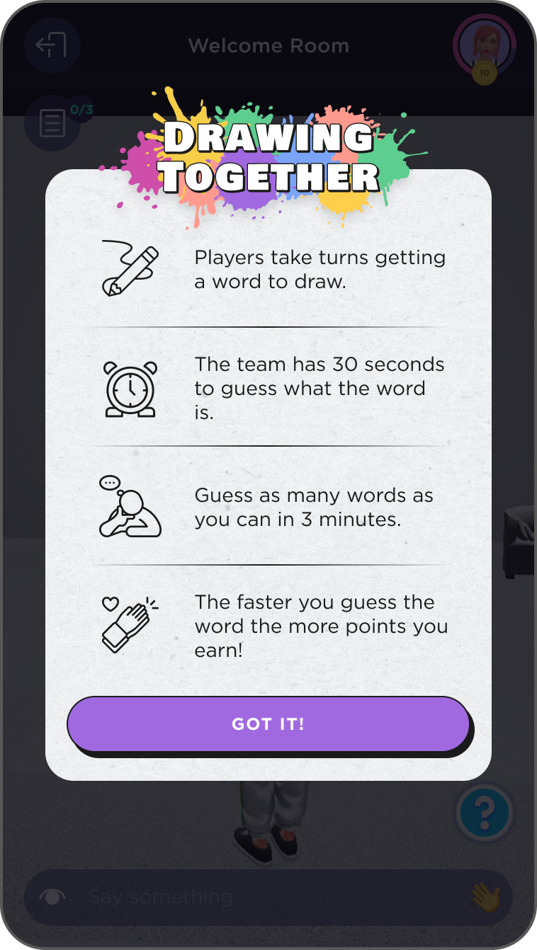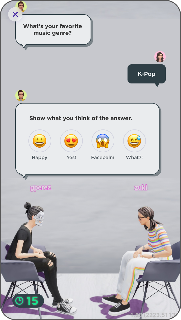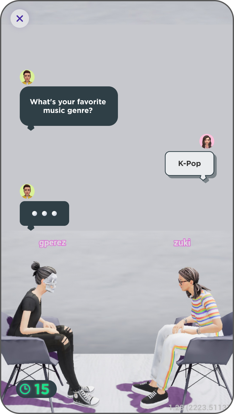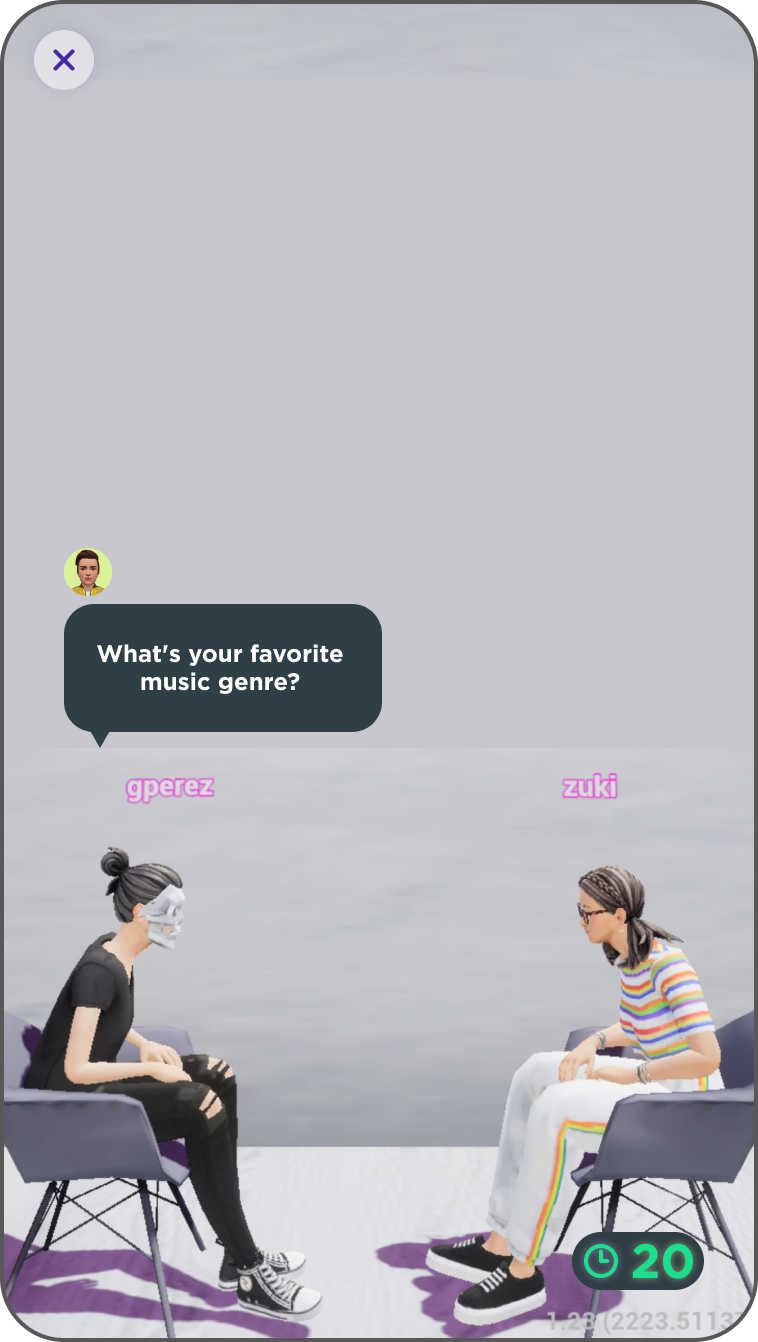 Chat Chair lowers the barrier to meeting someone new. It’s a two-seat ritual for low-pressure 1:1s: when one seat fills, the room gets a friendly invite; four short prompt-and-answer rounds keep things structured and positive—emotes included, with no open text during play to avoid negativity. Chairs are themed (movies, music, etc.) to align interests without extra UI weight. At the end, players can keep chatting and add each other as friends.
