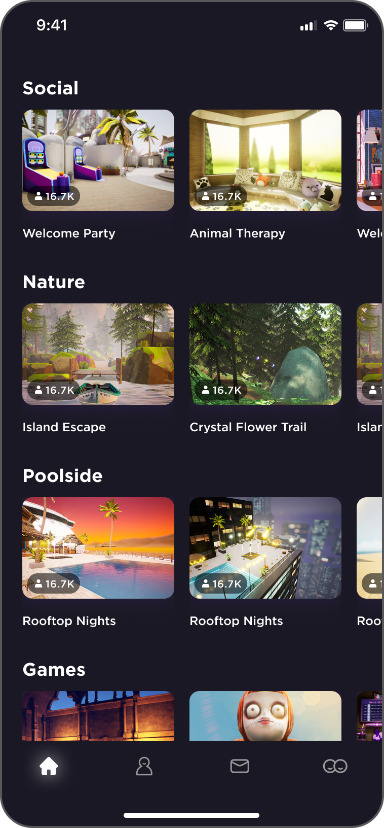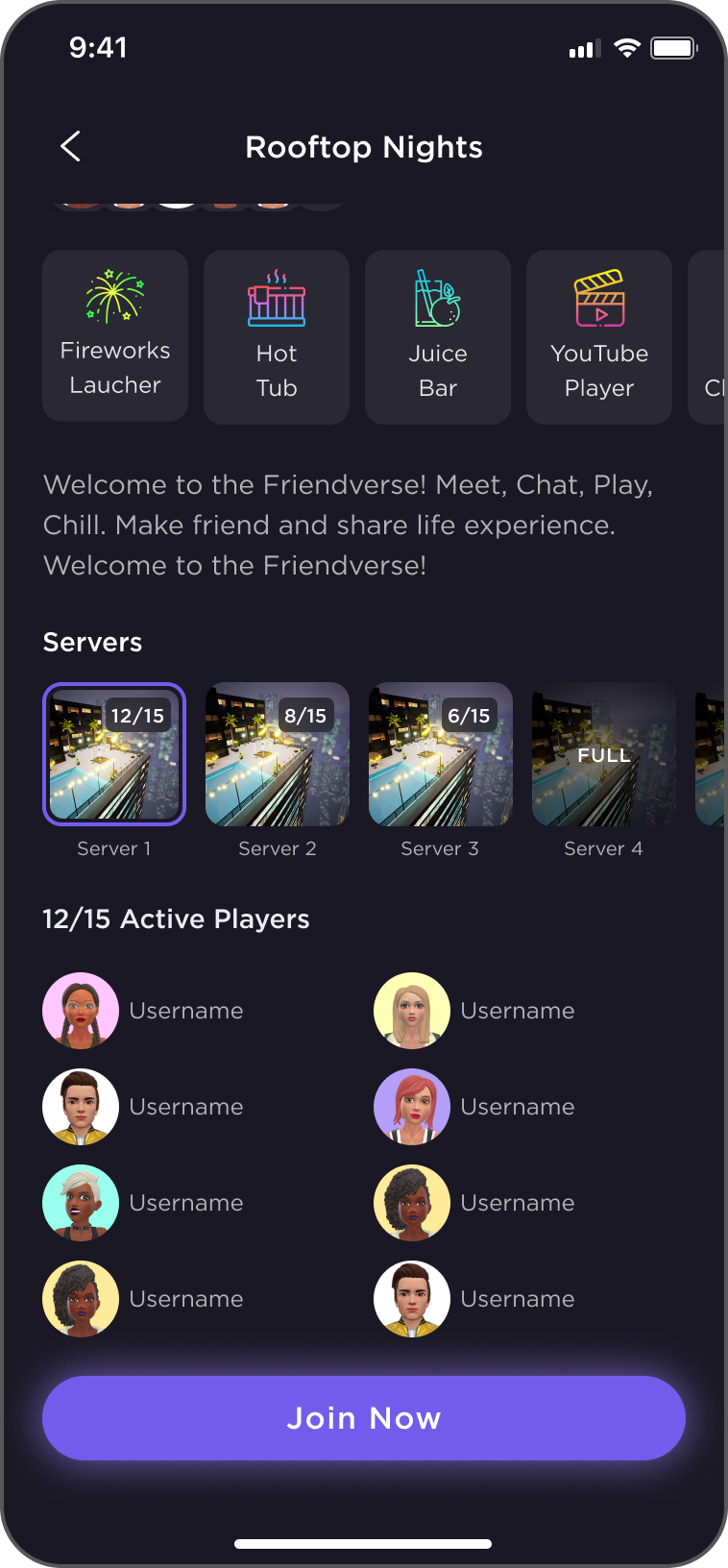 Discovery is the product’s first promise: show me where my people are and why I should join now. Each room card answers that at a glance—friends already inside, what you can do (activity chips), who’s hosting, and what’s playing. Themed swimlanes group rooms by vibe, and one-tap join removes friction. A dark theme of purple (trust/identity) and teal (fresh energy) keeps it legible and on-brand.