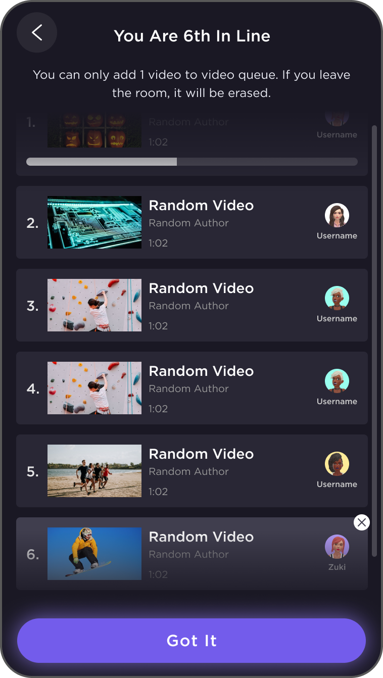 Once you’re in, we make watching together actually feel together. The early “everyone controls YouTube” model caused thrash, so we redesigned it as a YouTube queue with role clarity and fairness: host-led playback when present, democratic FIFO when not, one slot per person, and a vote-to-skip that only counts engaged viewers.